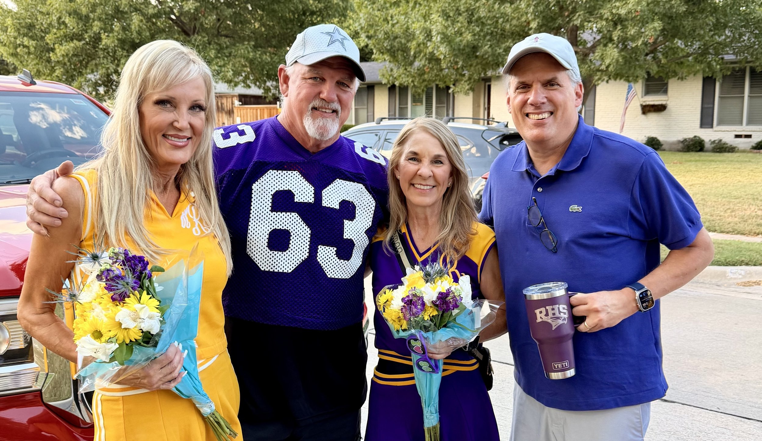 Next, I shined up the car and met Clay that afternoon to pick up purple-and-gold flower bouquets for the girls. We briefly considered traditional Homecoming mums… but let's be honest—buying a mum in Texas these days requires a 30-year mortgage and a counterweight rig to keep it from toppling the poor girl wearing it. The last thing I needed was for the weight of one of those things to send my convertible into a parade-day wheelie.